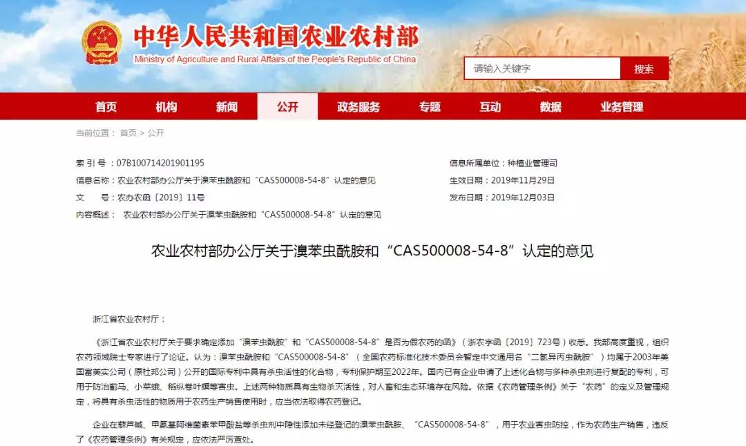 日前,浙江省農業農村廳就向農業農村部發了一個函件,要求確定,添加“溴苯蟲酰胺”和“CAS500008-54-8”是否為假農藥。