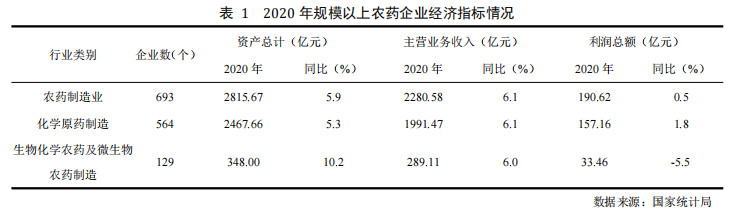 2020年上半年,受新冠肺炎疫情影響,部分企業不能正常開工,一定程度上影響行業經濟指標。但全年來看,全行業主要經濟指標依然保持增長。國家統計局數據顯示,2020年全國農藥行業693家規模以上企業資產總計2815.67億元,同比增長5.9%;主營業務收入2280.58億元,同比增長6.1%;利潤總額190.62億元,同比增長0.5%,其中,化學原藥利潤總額同比增長1.8%,生物化學農藥及微生物農藥同比下降5.5%(詳見下表)。