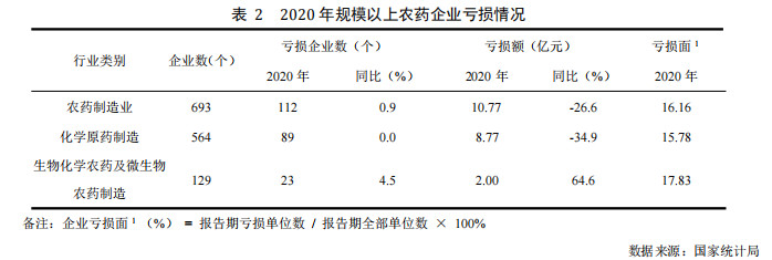 國家統計局數據顯示,2020年全國農藥行業693家規模以上農藥企業虧損企業數112家,同比增長0.9%;虧損額為10.77億元,同比下降26.6%;虧損面16.16%,其中化學原藥制造業虧損面為15.78%,生物化學農藥及微生物農藥制造虧損面為17.83%。