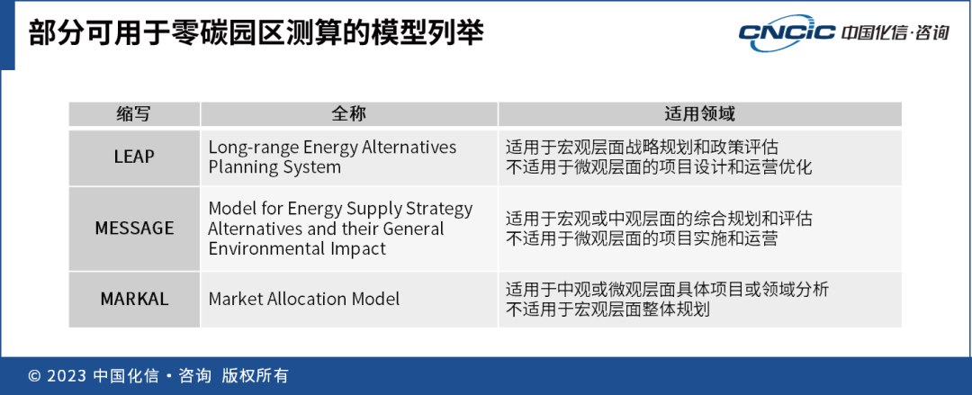 測算模型是零碳/低碳園區打造的重要工具手段,基于模型的預測、核算與評估,可以使零碳園區打造的行動目標更加清晰、行動方案更具可行性、使數據更具精確性、使經濟運作更具可控性以及收支合理性。