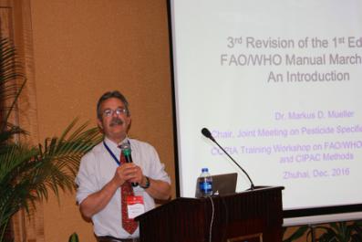 FAO/WHO《手冊》第一版自2002年出版,2010年第二次修訂,2016年第三次修訂,JMPS主席Markus D. Mueller博士簡要介紹了三個(gè)版本變更內(nèi)容及標(biāo)準(zhǔn)修訂的流程,列出JMPS對舊標(biāo)準(zhǔn)更改為新標(biāo)準(zhǔn)的優(yōu)先等級、數(shù)據(jù)需求和轉(zhuǎn)換過程,向參會代表逐一列舉評估一個(gè)產(chǎn)品標(biāo)準(zhǔn),有效成分、物化特性和毒理可以依據(jù)的手冊指引,以及如何劃分產(chǎn)品是等同性標(biāo)準(zhǔn)還是新標(biāo)準(zhǔn),各標(biāo)準(zhǔn)需要提交的支持性文件。