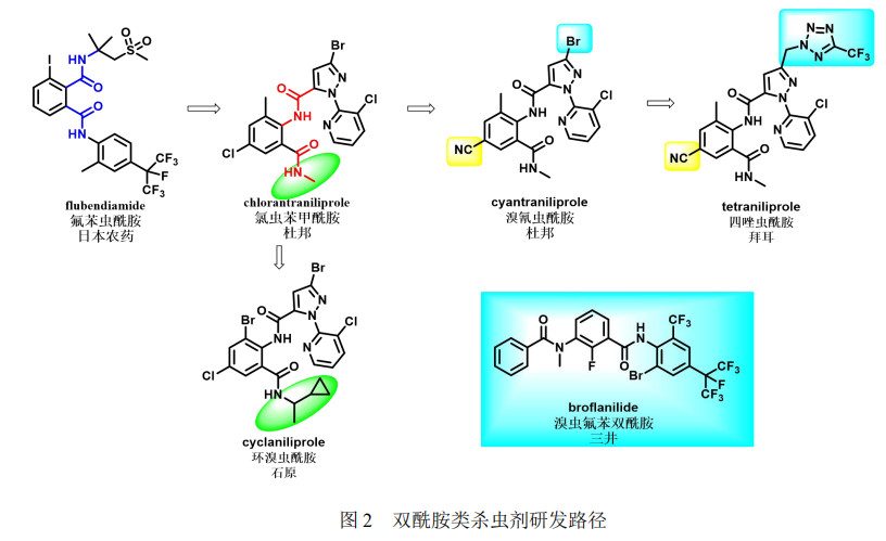 雙酰胺類殺蟲劑具有廣譜、高效、低毒的特點,其中氟苯蟲酰胺是一個開創性的產品,帶來了新的作用機制和新的結構類型,標志著一個新時代的到來,但氟苯蟲酰胺對水生生物安全性存在高風險。杜邦公司在氟苯蟲酰胺基礎上發現了突破性的產品氯蟲苯甲酰胺,此產品對水生生物的安全性大大改善。杜邦公司將氯蟲苯甲酰胺苯環上的氯原子替換成氰基得到溴氰蟲酰胺,一個簡單的替換,帶來了殺蟲譜的改變。溴氰蟲酰胺不但可以防治咀嚼口器害蟲,還可以防治蚜蟲、飛虱等刺吸口器害蟲及薊馬等銼吸口器害蟲。拜耳公司將溴氰蟲酰胺結構中吡唑環上的溴原子替換成四唑甲基得到新的殺蟲劑四唑蟲酰胺。與氯蟲苯甲酰胺相比,四唑蟲酰胺殺蟲譜進一步擴大,殺蟲活性提高。石原公司將氯蟲苯甲酰胺結構中的甲基替換成環丙甲基得到環溴蟲酰胺,環溴蟲酰胺具有廣譜的殺蟲活性。