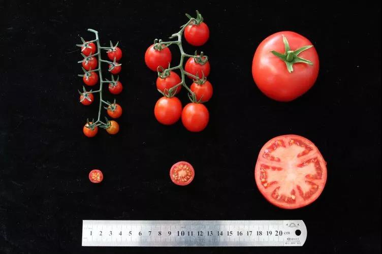 首先野生番茄被馴化成為櫻桃番茄,就是我們通常說的圣女果;櫻桃番茄再經過改良成為大果番茄;大果番茄再通過不同的選擇形成不同類型的分化。