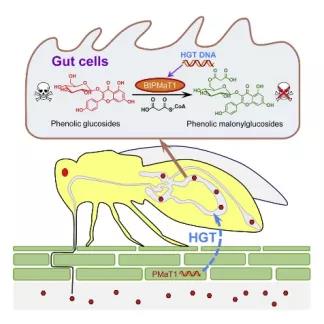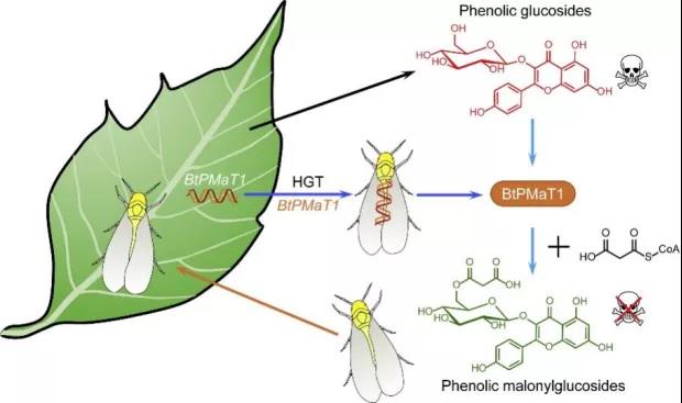 這本是一個非常巧妙的方法,可百密一疏,最重要的解毒劑配方,編碼酚苷丙二酰轉(zhuǎn)移酶的基因BtPMaT1,卻被蚜蟲的親戚,體長不過1毫米的小蟲--煙粉虱,偷走放進了自己的基因組中,世代傳承。