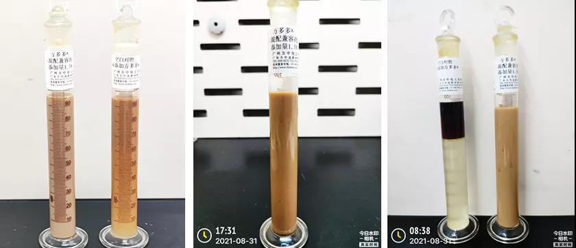 試驗結論:添加方多多®兼容劑0.5%-2%,具有顯著的改善藥劑混配出現的絮凝、分層、沉淀、結底現象。