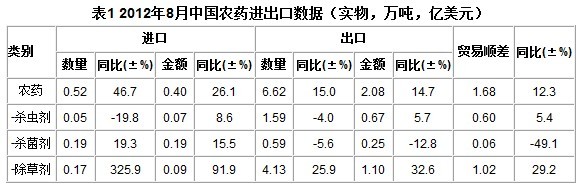 根據國家海關總署統計,2012年1~8月累計進口農藥4.78萬噸,同比增加23.2%,進口金額4.23億美元,增長18.3%,平均進口單價8849.4美元/噸,進口單價同比下降4.13%。其中殺蟲劑平均進口單價最高,為1.59萬美元/噸,較去年同期持平。進口農藥相當于國產農藥產量的2.1%(如表1)。