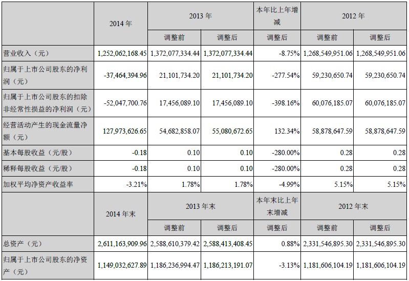 江蘇藍豐生物化工股份有限公司今日披露2014年年度報告,報告期內,公司營業收入12.52億元,比上年同期下降8.75%。主要會計數據和財務指標如下表: