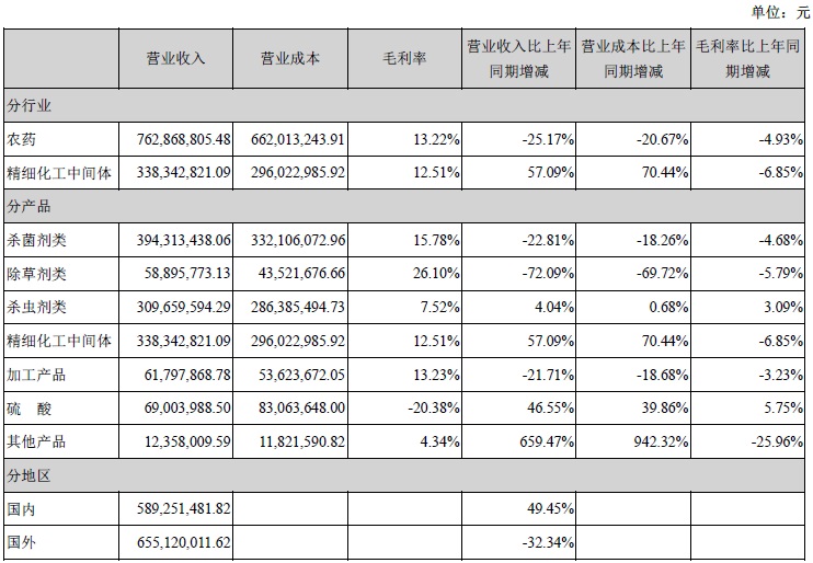 報告顯示,2014年,藍豐生化農藥收入7.63億元,同比下降25.17%。具體分行業和分產品情況如下:
