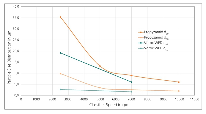 圖5:粒度分布隨分級機速度而變化,CGS 16流化床氣流粉碎機粉碎兩種除草劑