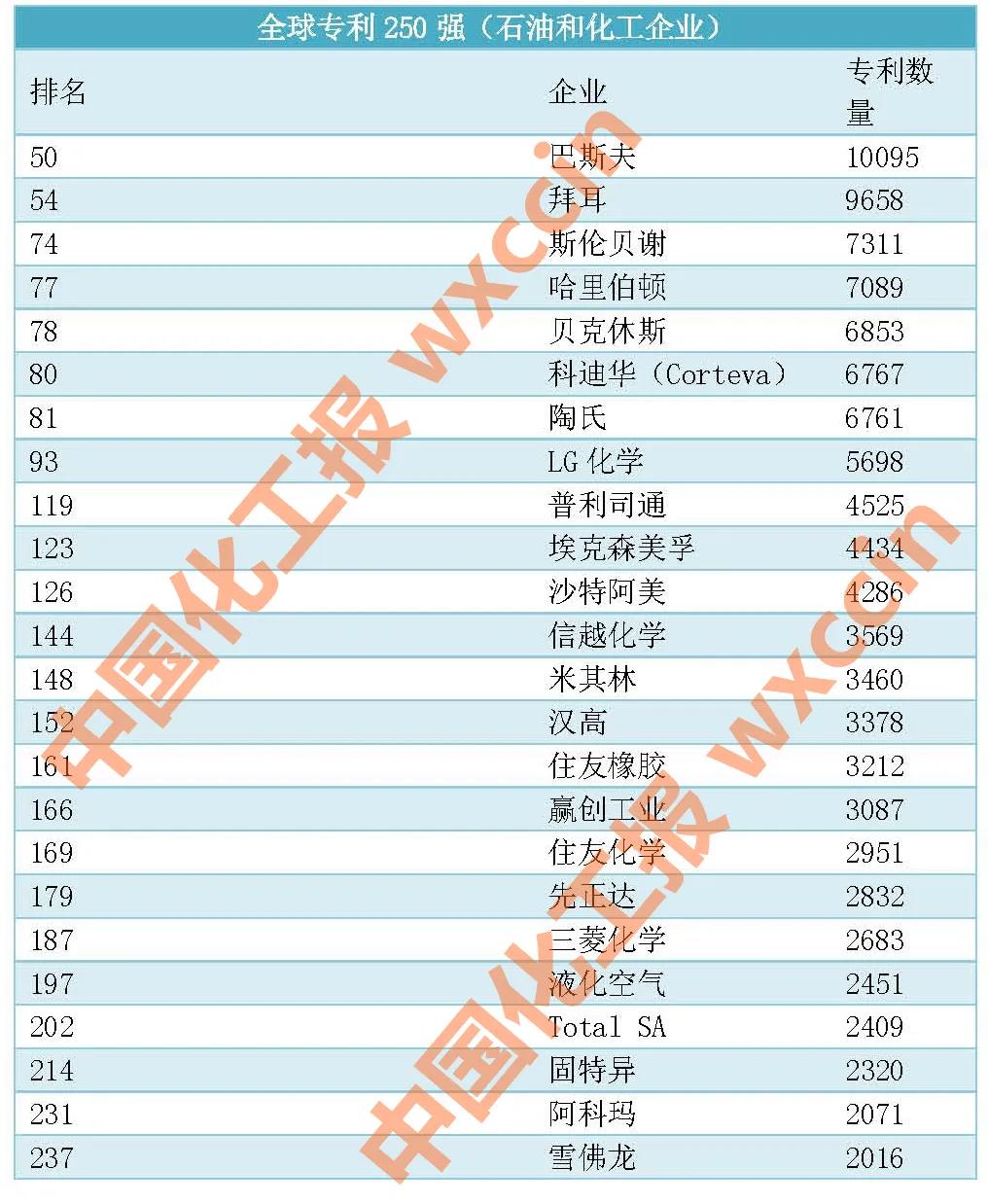 石油和化工企業(yè)有24家上榜250強:巴斯夫排名最高,位列50位,持有專利數(shù)10095件;拜耳位列54位,持有專利數(shù)9658件。