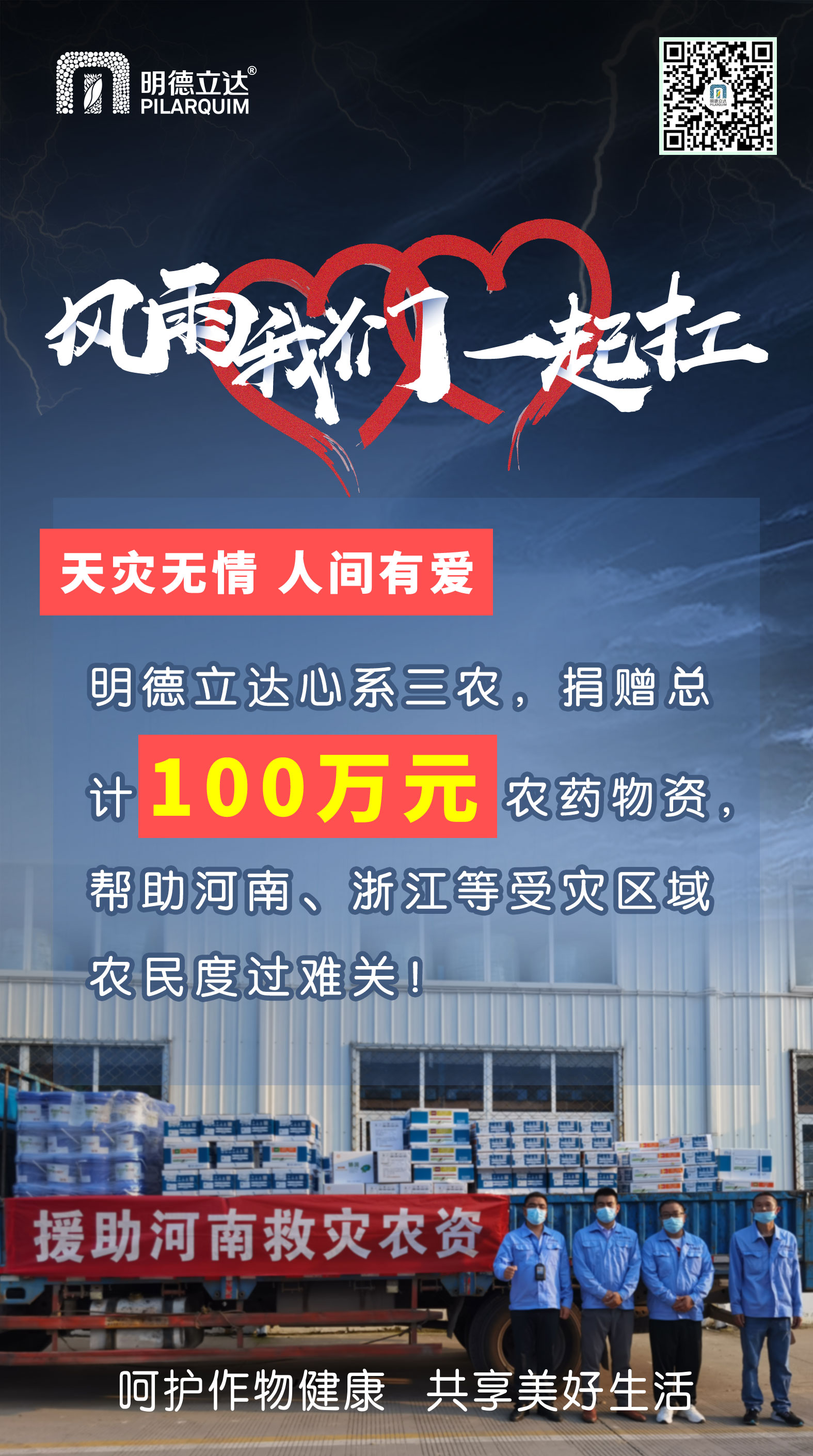 據(jù)明德立達(Pilar)集團營銷支持部經(jīng)理羅寶民介紹,明德立達(Pilar)集團的核心價值觀是“以客戶為中心,為顧客創(chuàng)造價值”,始終秉承“呵護作物健康,共享美好生活”的經(jīng)營理念,做一個有社會擔當?shù)拿褡迤放破髽I(yè),積極投身社會公益事業(yè)。在河南、浙江等地遭受暴雨洪水災(zāi)害后,大量農(nóng)作物被洪水浸泡,農(nóng)民朋友面臨嚴峻的農(nóng)作物災(zāi)后恢復考驗。明德立達(Pilar)集團作為一家集研發(fā)、生產(chǎn)、營銷和服務(wù)為核心的農(nóng)藥制劑企業(yè),災(zāi)情發(fā)生后,集團董事長母燦先第一時間到河南實地察看受災(zāi)情況,集團營銷部組織市場部、工廠和子公司等部門迅速研究災(zāi)后農(nóng)作物恢復施救措施,并通過工廠加班加點緊急組裝一套集土傳病害防治,促進根系和植株生長的“健根護苗小組長”(內(nèi)含明迪、明沃、明農(nóng)心、碧益、農(nóng)伯旺、健麗),安排專車發(fā)往災(zāi)區(qū),免費捐贈給需要的農(nóng)民朋友,并組建災(zāi)后重建技術(shù)服務(wù)小組,及時把用藥技術(shù)和補救方法隨同農(nóng)藥物資送到農(nóng)民朋友手中。