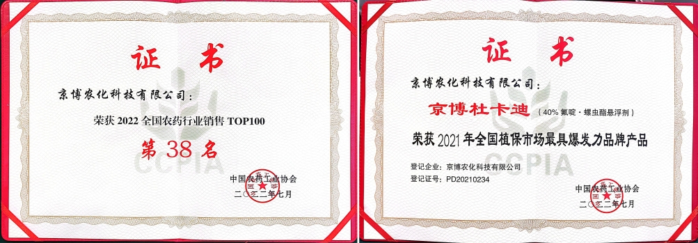 喜訊!京博杜卡迪榮獲“2021年全國植保市場最具爆發力品牌產品” 近日,中國農藥工業協會主辦的第九屆中國農藥行業經濟運行分析會在浙江紹興召開,會上公布了2021年全國農藥行業銷售TOP100、2021年全國植保市場最具爆發力品牌產品等獎項名單。京博農化持續排名百強前列,京博杜卡迪榮獲“2021年全國植保市場最具爆發力品牌產品”。