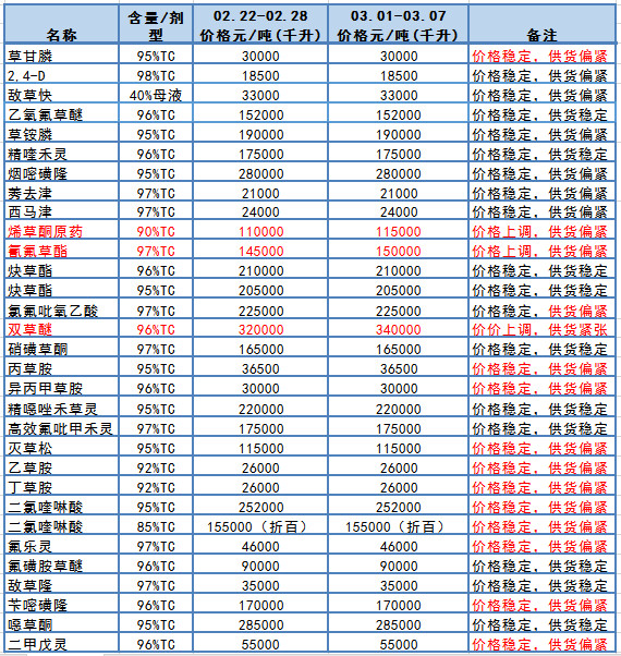 90%烯草酮原藥上漲5,000元,至115,000元/噸;97%氰氟草酯原藥上漲5,000元,至150,000元/噸;96%雙草醚原藥上漲20,000元,至340,000元/噸。