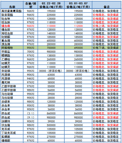 96%聯(lián)苯菊酯原藥、97%吡蟲啉原藥、97%啶蟲脒原藥、95%噻蟲嗪原藥、97%吡蚜酮原藥、95%阿維菌素精粉、70%甲氨基阿維菌素苯甲酸鹽原藥、97%螺螨酯原藥、96%乙螨唑原藥、97%(96%)噠螨靈原藥、97%(98%)乙酰甲胺磷原藥、茚蟲威(3∶1和9∶1)原藥、98%伏蟲隆原藥供貨偏緊。