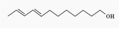 活性成分:反-8,反-10-十二碳二烯醇,(E,E)-8,10-dodecadien-1-ol,codlemone;CAS號:33956-49-9;分子式:C12H22O;相對分子質量:182.3。理化性質:熔點32℃,閃點(78.8±17.1)℃,沸點(216.8±9.0)℃/760 mmHg,蒸氣壓168 mPa/25℃,折射率1.4282/20℃。溶解度(20℃):水中25.48 mg/L,易溶于有機溶劑,在常溫常壓下貯存穩定。結構式: