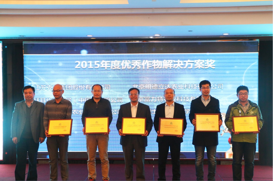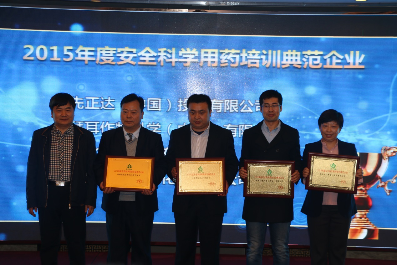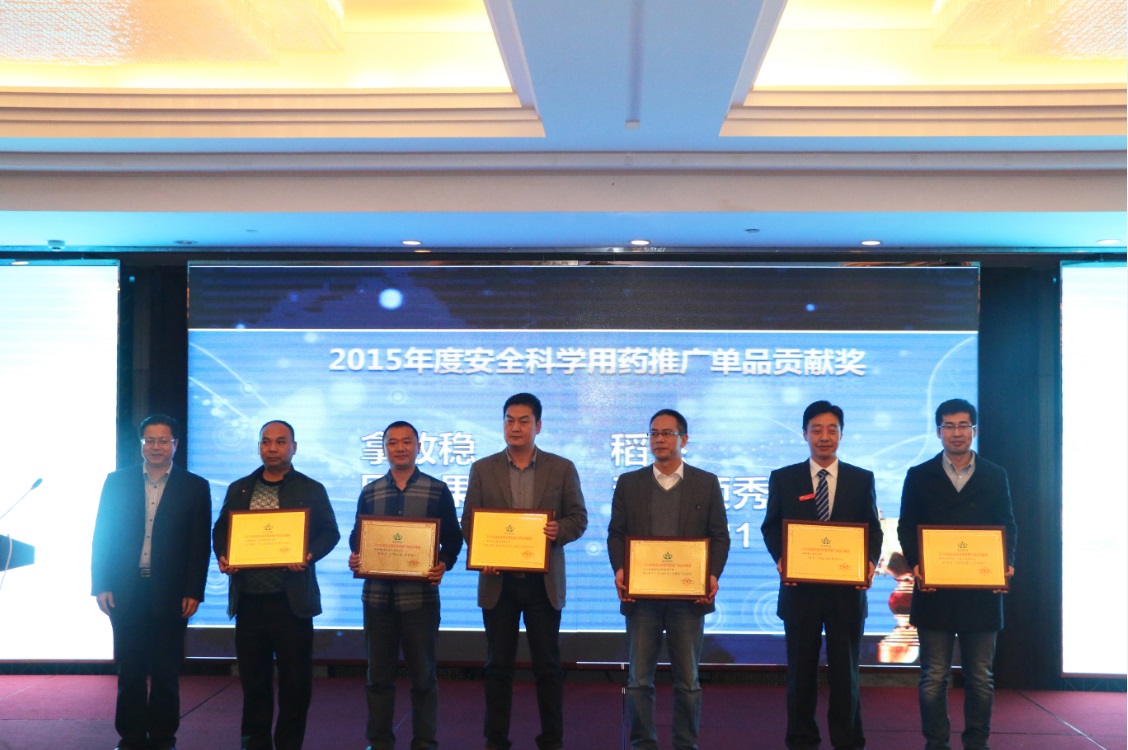 “首屆安全科學用藥,減量施藥示范企業”頒獎儀式,將本屆會議推向了高潮。為了更好地推進安全科學使用農藥培訓工作,貫徹落實農業部提出的《到2020年農藥使用量零增長行動方案》,更好地發現、樹立、宣傳具有社會責任感的安全科學用藥培訓示范企業,中國農藥工業協會安全科學使用農藥委員會通過對各企業在該領域所做工作的綜合評價,共設定2015年度安全科學用藥培訓典范企業、2015年度優秀作物解決方案獎、2015年度安全科學用藥推廣單品貢獻獎和2015年度減量施藥特色服務企業四個獎項,來自國內農藥行業各領域的24家企業獲得表彰,中國農藥工業協會會長孫叔寶、農業部農產品質量安全中心副主任顧寶根、中國農藥工業協會秘書長李鐘華、安徽省農藥工業協會理事長陳槐青分別為獲獎企業頒獎。