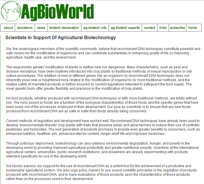 作為科學研究領域的成員,我們在此署名,堅信DNA重組技術(即轉基因技術)是安全強大的生物改良手段,能在發展農業、改進醫療和改善環境等方面做出極大貢獻,以提高人類的生活質量。