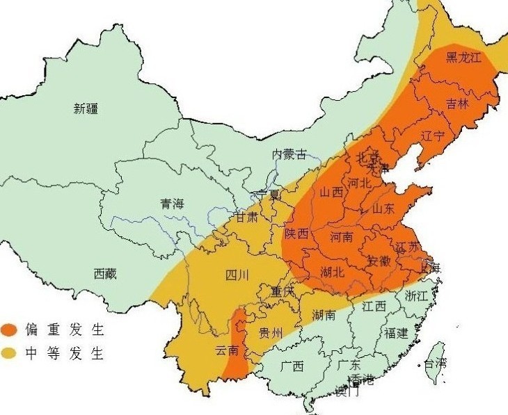小麥條銹病在四川東北部、西北東南部偏重流行,西南和西北其他地區、漢水流域中度流行,黃淮和華北南部麥區偏輕流行,流行面積約3000萬畝。