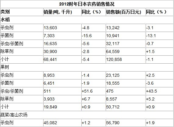 據日本作物保護協會統計,日本農用化學品銷售額連續兩年保持上漲,在2011年10月至2012年9月的2012財年,銷售額達3329.8億日元,微增1.3%(按當前匯率計為39億美元)。銷量為197,003萬噸,增加了0.7%。