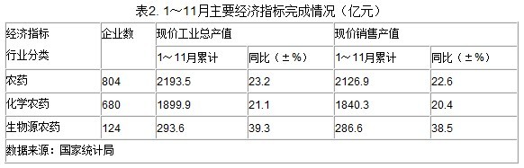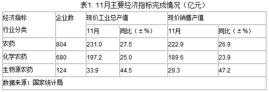 根據國家統計局統計,2012年11月份,全國農藥行業完成工業總產值231.0億元,同比增長27.5%;完成現價銷售產值222.9億元,同比增長26.9%。其中生物源農藥工業總產值和銷售產值漲幅均超過40%。