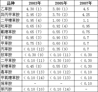 2003、2005、2007年酰胺類除草劑品種市場(億美元)(括號內(nèi)為當年排位)
