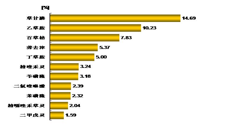 2.前11位主流產(chǎn)品占國內(nèi)2009年除草劑市場份額的60%