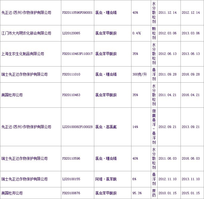 已獲得農藥登記證書的氟蟲雙酰胺和氯蟲苯甲酰胺產品信息: