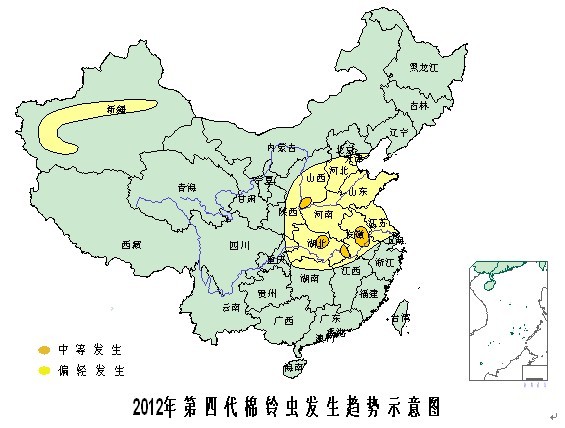 各大棉區第三代成蟲盛期(成蟲盛期后3天即為卵盛期),長江流域棉區在8月中下旬,黃河流域和南疆棉區為8月下旬至9月初;大部棉區較常年同期接近或偏早偏晚1-2天。