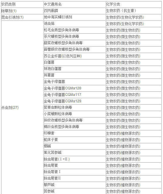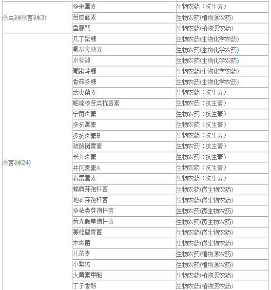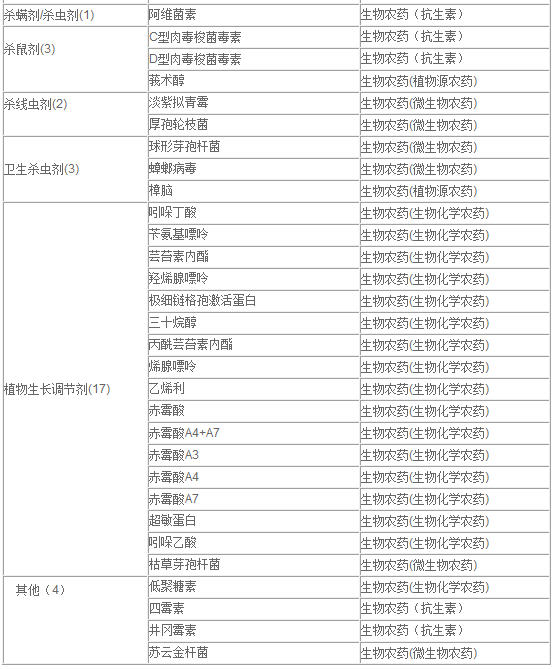 蟲劑,2種殺線蟲劑,1種除草劑,其他4種。從化學分類上看,微生物農藥有28種,生物化學農藥24種,18種為植物源農藥,16種為抗生素。