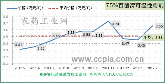 75%百菌清可濕性粉劑2月均價在3.66萬元/噸,高于處于高位。據中國農藥工業網數據統計,該產品本月國內銷量為105噸,產量為186噸,約比一月份上漲23個百分點。具體走勢圖如下: