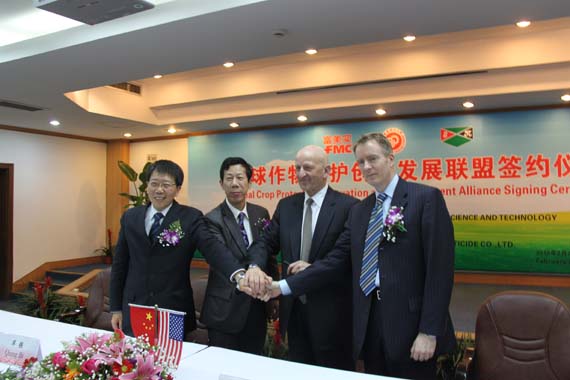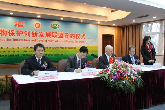 由美國FMC﹙富美實﹚公司、上海生農(nóng)生化制品有限公司、華東理工大學(xué)組成的全球作物保護(hù)創(chuàng)新發(fā)展聯(lián)盟于2012年2 月21日在上海簽約。