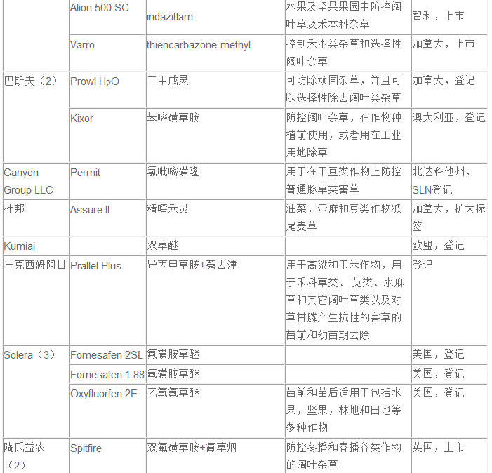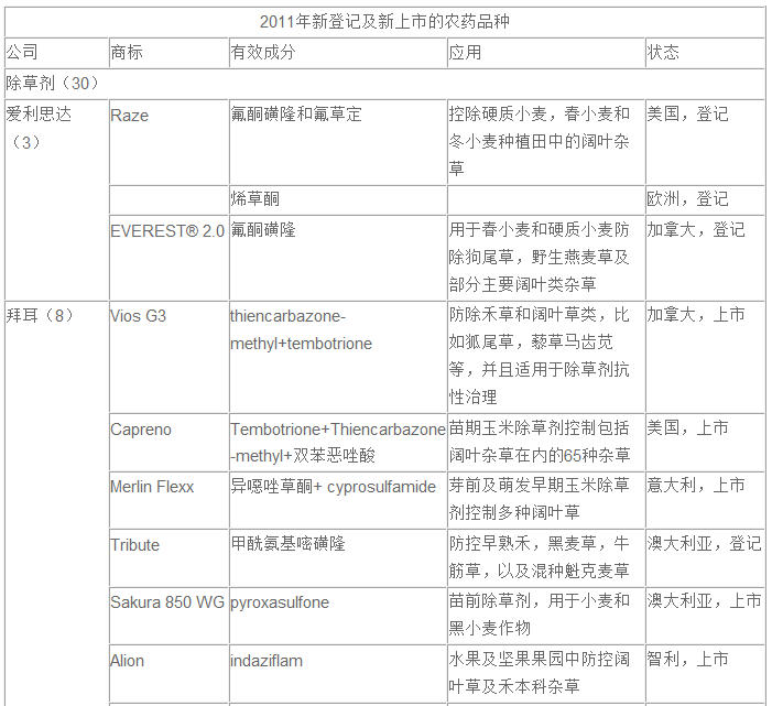 據相關數據統計,2011年在國外新登記或上市的農藥品種一共有88個(包括特別登記)。除草劑最多,殺蟲劑最少,殺菌劑居中。除草劑新產品為30個,其中,拜耳作物科學最多,有8個;其次是先正達公司,共有6個除草劑新品獲得登記或上市。共12家公司。混劑9個。殺菌劑共19個產品,有8家公司。拜耳有5個,其次是巴斯夫4個,先正達和杜邦各3個產品,混劑8個。殺蟲劑共有9個公司的15個產品,拜耳最多占了4個,杜邦、陶氏益農和先正達各2個。生物農藥共11個,種子處理劑7個,生長調節劑3個,熏蒸劑、衛生殺蟲劑和殺螨劑各1個。