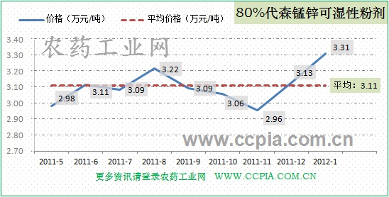 80%代森錳鋅可濕性粉劑主要用于蔬菜、果樹、棉花、苗木等作物上的各種生育期的炭疽病、早疫病等多種病害的防治。1月份均價為3.31萬元/噸,比前一階段有所上揚(yáng)。自2011年5月至今,80%代森錳鋅可濕性粉劑平均價位為3.11萬元/噸。