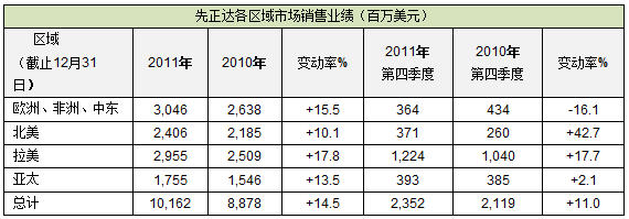 先正達2011財年第四季度銷售額增長了11%,達23.52億美元。增長受恒定匯率和美洲第四季度的強勁增長推動,尤其是北美洲,非選擇性除草劑的銷售繁榮。與去年同期相比,銷售額實現了兩位數的增長,2011年全年作物保護業務的業績同樣強勁,首次突破了100億美元。第四季度,種子和性狀業務表現平平,但從全年的統計數據來看,增長率達到了兩位數。2011年全年公司所有業績和收益均實現兩位數的增長,利潤率增長到22%左右。