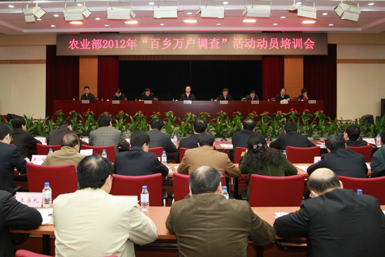 本網(wǎng)訊 2月7日,農(nóng)業(yè)部召開動(dòng)員培訓(xùn)大會(huì),啟動(dòng)2012年“百鄉(xiāng)萬戶調(diào)查”活動(dòng)。農(nóng)業(yè)部決定,從部系統(tǒng)選派123名機(jī)關(guān)干部和農(nóng)技人員(以機(jī)關(guān)干部為主),分成30個(gè)組從即日起深入27個(gè)省份開展為期1個(gè)月的駐鄉(xiāng)進(jìn)村入戶調(diào)查。部長韓長賦在會(huì)上要求,調(diào)查組同志要以積極熱情的態(tài)度、高度負(fù)責(zé)的精神、求真務(wù)實(shí)的作風(fēng),下到基層、走進(jìn)農(nóng)村、遍訪農(nóng)戶、廣查農(nóng)情,把中央強(qiáng)農(nóng)惠農(nóng)富農(nóng)政策送到千家萬戶,把農(nóng)業(yè)部門推動(dòng)增糧增收的重點(diǎn)措施落到田間地頭,推動(dòng)實(shí)現(xiàn)“穩(wěn)中求進(jìn)”總目標(biāo)、確保農(nóng)業(yè)農(nóng)村經(jīng)濟(jì)工作實(shí)現(xiàn)平穩(wěn)起步和良好開局。農(nóng)業(yè)部門要把干部深入基層調(diào)研、加強(qiáng)實(shí)踐鍛煉工作深入持久地開展下去,為鞏固發(fā)展農(nóng)業(yè)農(nóng)村經(jīng)濟(jì)好形勢(shì)提供動(dòng)力和保證。