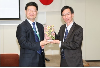 會(huì)談后,羅理事長(zhǎng)(左)與島津應(yīng)用技術(shù)部谷川部長(zhǎng)互換禮品