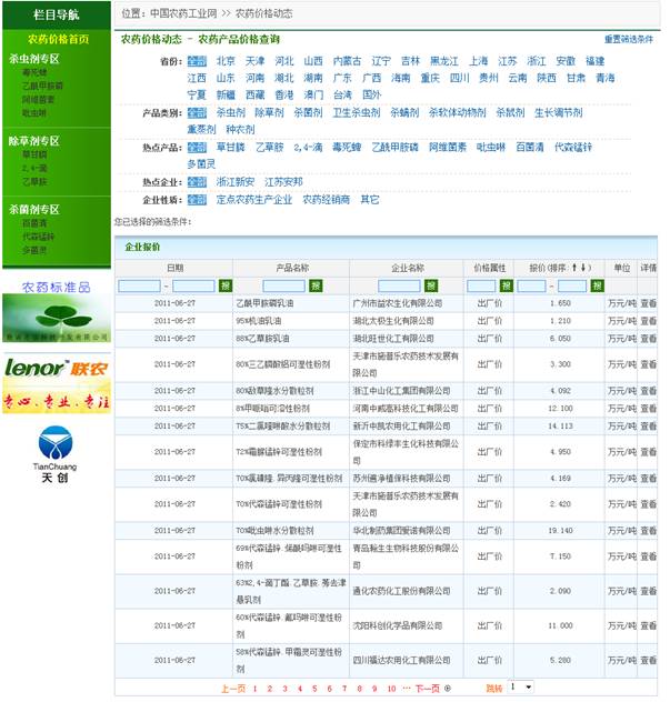 農藥價格動態欄目今日正式上線開通了,注冊會員后,您即可免費查詢實時的農藥市場價格動態,針對大宗農藥產品,還會陸續有市場趨勢預測、行情分析總結等功能,歡迎及時關注!新欄目簡單介紹如下: 欄目鏈接:http://m.jzhhw.cn/price_news.asp 1、農藥企業每日報價,并配合強大的搜索功能,方便用戶查詢。 2、大宗產品市場行情分析 3、市場快訊,及時把握企業動態 感謝您對中國農藥工業網的關注和支持,我們將不斷豐富和完善會員服務功能,為您提供更貼心、方便的服務。如有其它疑問,請致電中國農藥工業網咨詢電話010-84885067。
