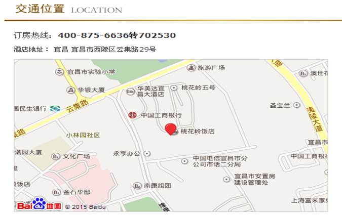 桃花嶺飯店(地址:湖北省宜昌市西陵區云集路29號,電話:400-875-6636轉702530),會議房價450元/間.天。