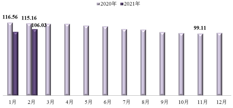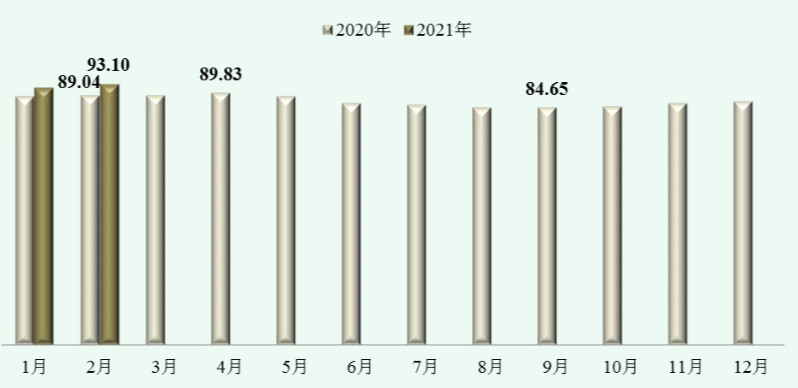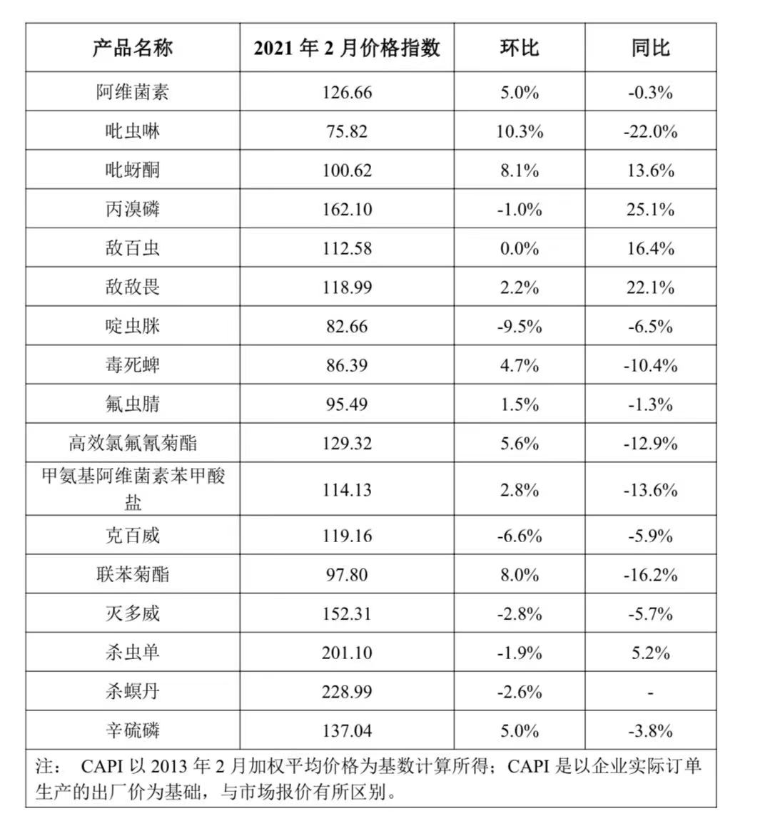 2021年2月,中國(guó)農(nóng)藥價(jià)格指數(shù)繼續(xù)上揚(yáng)。據(jù)中國(guó)農(nóng)藥工業(yè)協(xié)會(huì)統(tǒng)計(jì),2月農(nóng)藥價(jià)格指數(shù)(CAPI)為93.10,環(huán)比上漲1.56%,同比上漲4.56%。