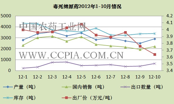 毒死蜱原藥10月份開工企業數保持穩定,產量略漲15.46%,其中南京紅太陽產量上漲12.78%,江蘇豐山集團產量與9月持平,江蘇寶靈產量環比上漲34.27%。但較去年同期產量同比下降16.04%。 2012年殺蟲劑市場普遍看好,年初毒死蜱原藥價格也隨原材料價格上漲而水漲船高,但較其他殺蟲劑產品來說毒死蜱漲幅小,價格于5月開始下滑,10月份價格下滑到2012年的最低點,出廠價僅為3.64萬元/噸,同比下降1.89%。庫存較豐富,但下游部分企業持觀望態度,市場成交量略漲,環比上升13.81%,冬儲市場方面成交量并不多。 10月份自營出口量增長58.05%,近幾年來,毒死蜱出口量和創匯高速增長,對提升市場價格也有一定推動作用。 庫存環比上升0.69%,同比下降17.74%。 企業信息:2011年, 利爾化學的毒死蜱原藥車間完成試生產并生產銷售了小批量產品,截止2012年9月30日,該車間廠房設備的賬面凈值為2533.62萬元,建成后尚未實現效益。2012年11月20日公告,審議通過了《關于對3000噸/年毒死蜱原藥車間設施進行變更的議案》。公司決定拆除位于綿陽本部的毒死蜱生產線,將其改造成公司現有主力產品的配套中間體生產設施。 本文作者:張慧 電話:010-84885067 郵箱:zhanghui@ccpia.com.cn 中國農藥工業網http://m.jzhhw.cn獨家新聞,不得轉載。