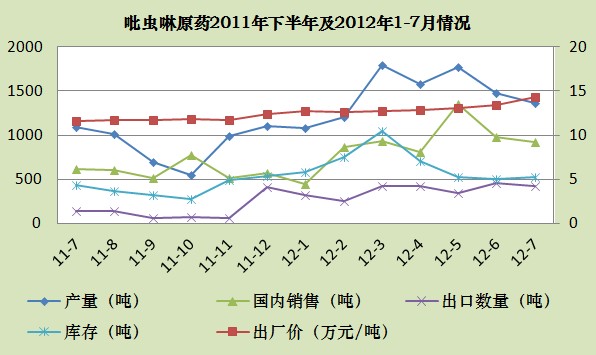 吡蟲啉原藥2012年總體情況較2011年回暖,產、銷等各項數據均比去年同期看好。特別是價格從年初一直小幅度上揚,從年初的12.7萬元/噸,上漲到14.32萬元/噸,環比上漲6.94%,同比上漲23.45%。