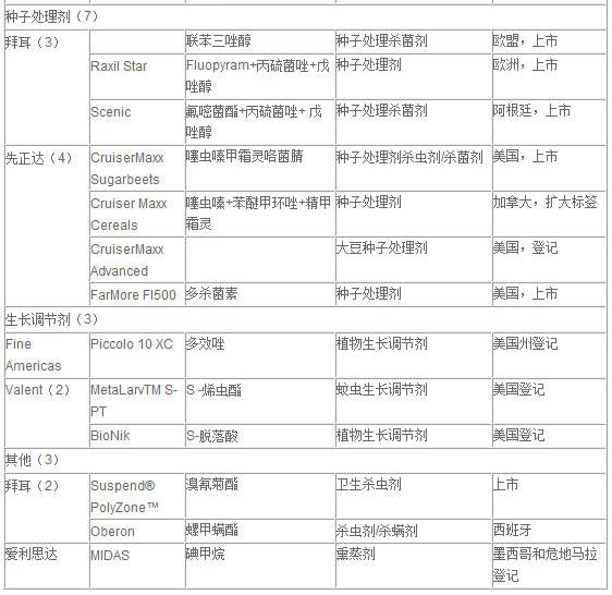 據統計,2011年在國外新登記或上市的農藥品種一共有88個(包括特別登記)。除草劑最多,殺蟲劑最少,殺菌劑居中。除草劑新產品為30個,其中,拜耳作物科學最多,有8個;其次是先正達公司,共有6個除草劑新品獲得登記或上市。共12家公司。混劑9個。殺菌劑共19個產品,有8家公司。拜耳有5個,其次是巴斯夫4個,先正達和杜邦各3個產品,混劑8個。殺蟲劑共有9個公司的15個產品,拜耳最多占了4個,杜邦、陶氏益農和先正達各2個。生物農藥共11個,種子處理劑7個,生長調節劑3個,熏蒸劑、衛生殺蟲劑和殺螨劑各1個。
