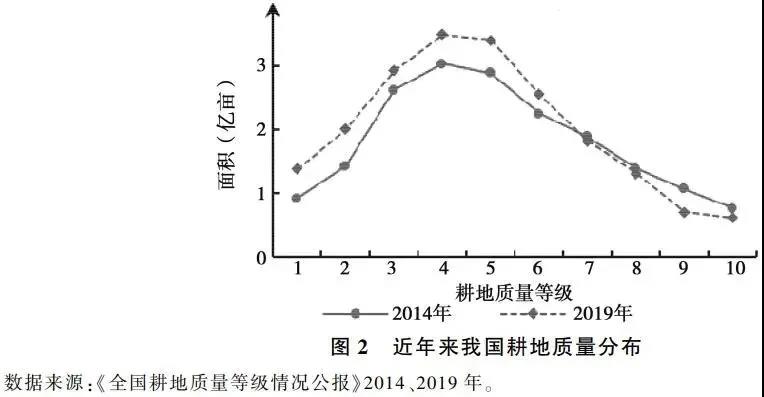 耕地質(zhì)量保護(hù)與提升是現(xiàn)代農(nóng)業(yè)生產(chǎn)中穩(wěn)定糧食數(shù)量和保障糧食質(zhì)量的核心,更是實(shí)現(xiàn)農(nóng)業(yè)可持續(xù)發(fā)展的關(guān)鍵。人多地少的基本國(guó)情使得我國(guó)傳統(tǒng)糧食生產(chǎn)堅(jiān)持高投入、超負(fù)荷模式,造成耕地質(zhì)量呈現(xiàn)出中低產(chǎn)田面積大、退化面積大、污染面積大、有機(jī)質(zhì)含量低、補(bǔ)充耕地等級(jí)低、基礎(chǔ)地力低的“三大三低”特征。根據(jù)2014年和2019年全國(guó)耕地質(zhì)量等級(jí)情況公報(bào),近年來(lái)我國(guó)平均耕地質(zhì)量呈上升趨勢(shì),但評(píng)價(jià)為7至10等的耕地約為5億畝(等級(jí)越高,質(zhì)量越差),占耕地總面積的四分之一(圖2)。這部分耕地基礎(chǔ)地力相對(duì)較差,生產(chǎn)障礙因素突出,且難以在短時(shí)間內(nèi)得到根本改善。分區(qū)域來(lái)看,東北黑土區(qū)耕地的主要問(wèn)題在于黑土層變淺流失,土壤有機(jī)質(zhì)不足;華北及黃淮平原潮土區(qū)耕地耕層變淺,部分地區(qū)土壤鹽漬化嚴(yán)重;長(zhǎng)江中下游平原水稻土區(qū)耕地則面臨著土壤酸化、潛育化的風(fēng)險(xiǎn),部分地區(qū)耕地還存在嚴(yán)重的重金屬污染現(xiàn)象;南方丘陵崗地紅黃壤區(qū)耕地同樣存在土壤酸化、潛育化的問(wèn)題;西北灌溉及黃土型旱作農(nóng)業(yè)區(qū)耕地則在面臨土壤鹽漬化的同時(shí),還伴隨沙化和地膜殘留污染等問(wèn)題。