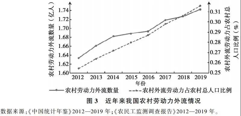 受到利益驅(qū)動(dòng),我國(guó)農(nóng)村勞動(dòng)力資源大量輸入第二、第三產(chǎn)業(yè),并與糧食穩(wěn)定增產(chǎn)保持一致性趨勢(shì)。合理的勞動(dòng)力流動(dòng)能夠促使不同產(chǎn)業(yè)部門相互協(xié)調(diào),有助于提高人均勞動(dòng)生產(chǎn)率,并分散糧食生產(chǎn)經(jīng)營(yíng)所面臨的各種風(fēng)險(xiǎn)。由于農(nóng)業(yè)機(jī)械化與勞動(dòng)力之間的要素替代關(guān)系,在不適合發(fā)展農(nóng)業(yè)機(jī)械化的丘陵山區(qū)、城市郊區(qū),農(nóng)村勞動(dòng)力轉(zhuǎn)移對(duì)糧食生產(chǎn)的改善作用會(huì)被削弱。另一個(gè)典型事實(shí)是,近年來(lái)農(nóng)村勞動(dòng)力外流數(shù)量以及其占農(nóng)村總?cè)丝诒壤掷m(xù)增加(圖3),已超過(guò)勞動(dòng)力轉(zhuǎn)移的“劉易斯拐點(diǎn)”。加之農(nóng)村人口老齡化的加劇,“未來(lái)誰(shuí)來(lái)種地”問(wèn)題成為社會(huì)各界人士的擔(dān)憂。一方面,青壯年勞動(dòng)力轉(zhuǎn)移使得部分地區(qū)出現(xiàn)了不同程度的耕地撂荒現(xiàn)象,或者引起復(fù)種指數(shù)的人為下降,不利于糧食數(shù)量安全;另一方面,留在農(nóng)村的“三八、六一、九九部隊(duì)”,由于時(shí)間分配、體能水平等約束,通常在糧食綠色生產(chǎn)技術(shù)采納方面劣勢(shì)明顯,不利于糧食質(zhì)量安全、產(chǎn)地生態(tài)安全。