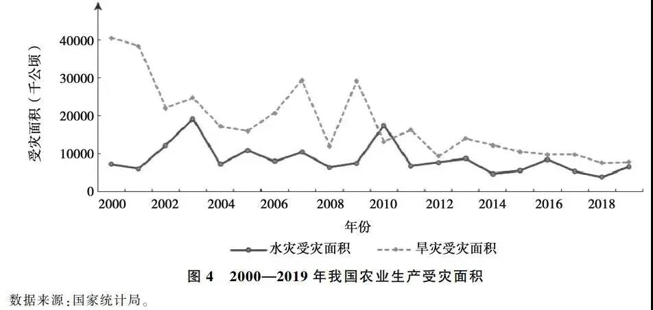 從現(xiàn)實(shí)來(lái)看,我國(guó)是全球氣候變化的敏感區(qū)和影響顯著區(qū),氣候變化已成為威脅我國(guó)糧食產(chǎn)量及穩(wěn)定性的主要作用因子。1951-2019年間,我國(guó)平均氣溫每10年便升高約0.24 ℃,升溫速率高于同期世界平均水平,極端高溫事件也顯著增加;年累計(jì)暴雨日數(shù)亦平均每10年增加約3.8%,極端強(qiáng)降水事件也呈增多趨勢(shì),而平均年降水日數(shù)趨于減少??梢灶A(yù)見(jiàn),隨著全球變暖持續(xù)加劇,我國(guó)農(nóng)業(yè)仍將面臨水災(zāi)、旱災(zāi)等氣候?yàn)?zāi)害帶來(lái)的不利影響(圖4)。更有研究預(yù)測(cè),到21世紀(jì)末,氣候變化可能使中國(guó)水稻、小麥和玉米的產(chǎn)量分別下降36.25%、18.26%和45.10%。