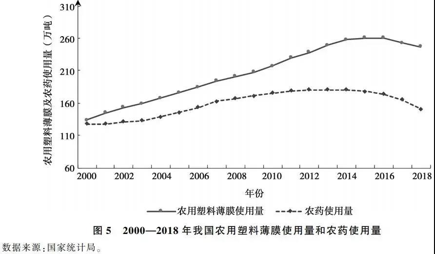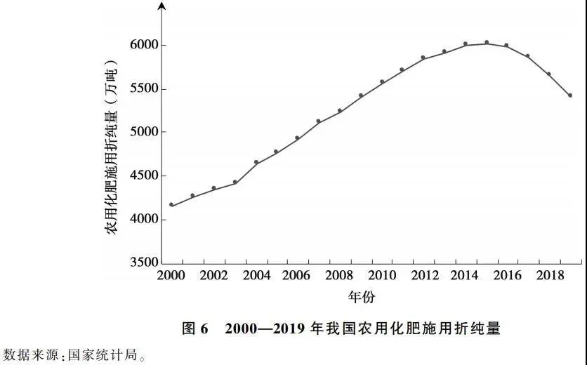農(nóng)業(yè)面源污染主要源于農(nóng)用化學(xué)品過(guò)量施用、農(nóng)業(yè)廢棄物的不合理處置等,防控和治理難度較大。就農(nóng)用化學(xué)品投入而言,2015年我國(guó)農(nóng)膜使用量260多萬(wàn)噸,而回收利用率不足三分之二,2018年使用量略有下降,但仍然高達(dá)247萬(wàn)噸(圖5)。農(nóng)藥殘留會(huì)流入河塘、溝渠,污染水體,使農(nóng)產(chǎn)品有毒物質(zhì)超標(biāo);化肥的過(guò)量施用使得總磷、總氮等大量污染物進(jìn)入水體及耕地土壤,污染地下水和耕地并對(duì)糧食質(zhì)量安全、產(chǎn)地生態(tài)安全造成影響。盡管我國(guó)2015年實(shí)施的化肥農(nóng)藥使用量零增長(zhǎng)行動(dòng)目標(biāo)已于2020年底順利實(shí)現(xiàn),但從總量上來(lái)看,農(nóng)藥使用量、農(nóng)用化肥施用折純量仍然不容樂(lè)觀(圖5、圖6)。就農(nóng)業(yè)有機(jī)廢棄物而言,農(nóng)作物秸稈、畜禽糞尿的不合理處置不僅對(duì)地表水、地下水造成污染,其大量堆積還會(huì)使得農(nóng)田過(guò)肥,對(duì)其造成腐蝕,進(jìn)而使農(nóng)田質(zhì)量降低乃至失去生產(chǎn)能力。據(jù)估計(jì),僅2014年中國(guó)農(nóng)作物秸稈資源量約為9.89億噸,畜禽糞尿資源量(鮮重)更是高達(dá)26.81億噸,而其中不少并未得到合理利用。