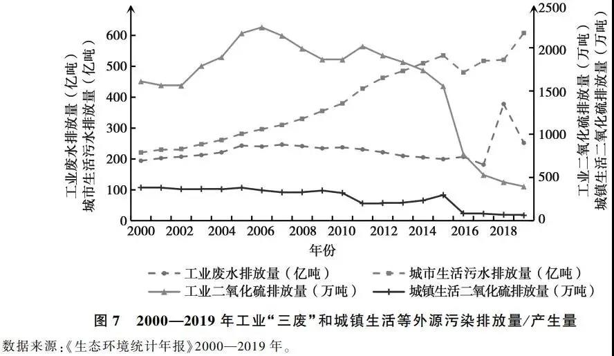 糧食安全所面臨的環(huán)境約束與工業(yè)化、城鎮(zhèn)化過(guò)程中引發(fā)的外源性污染不無(wú)關(guān)系。由于農(nóng)村地區(qū)生產(chǎn)要素價(jià)格較為低廉、環(huán)境規(guī)制較為寬松,大量工業(yè)企業(yè)將農(nóng)村視為“污染避難所”,向城郊、農(nóng)村地界進(jìn)駐。大量工業(yè)外源性污染由城市向農(nóng)村轉(zhuǎn)移,加之城鎮(zhèn)生活污水的過(guò)量排放(圖7),其結(jié)果必然帶來(lái)土壤污染加劇,進(jìn)而導(dǎo)致土地正常功能受限、土質(zhì)下降。據(jù)環(huán)境保護(hù)部、國(guó)土資源部于2014年發(fā)布的《全國(guó)土壤污染狀況調(diào)查公報(bào)》顯示,全國(guó)受污染耕地約占全部采樣耕地的19.4%,其中重金屬污染是元兇之一。更為嚴(yán)重的是,土壤污染物在糧食作物中蓄積,通過(guò)食物鏈逐級(jí)富集到人體,進(jìn)而對(duì)人體健康造成威脅。例如,近年來(lái)“鎘大米”“毒蔬菜”等事件屢屢發(fā)生,也引發(fā)了國(guó)民對(duì)糧食質(zhì)量安全的擔(dān)憂。