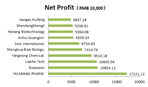 The ranking of net profit: Among over 20 listed companies in agricultural industry during the first quarter of 2016, except ZHEJIANG XINAN CHEMICAL and Gofa Company with loss, other companies are profitable. The net profit of Huabang Pharm is RMB 172 million, which ranks No.1, Noposion and Lianhe Tech are RMB 108 million and RMB 106 million, ranking respectively No.2 and No.3.