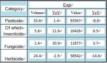 Category Imp Volume YoY Value YoY Pesticide 2.8 -1.0 22966 -7.3 Of which Insecticide 0.3 31.6 5739 21.3 Fungicide 0.9 9.7 8823 -5.0 Herbicide 1.0 -12.6 5712 -27.7 In 2016 Q1, the pesticide import total volume reached 28000 tons, a decrease of 1.0% YoY, and the import value reached 0.23 billion US dollars, a decrease of 7.3% YoY. The insecticide import total volume reached 3,000 tons, an sharp increase of 31.6% YoY, and imports amounted to 57 million US dollars, up by 21.3% YoY; the fungicide imports volume reached 9,000 tons, up 9.7% YoY, while imports value amounted to 88million US dollars, down 5.0 YoY; the herbicide imports volume reached 10,000 tons, up 12.6% YoY, while imports value amounted to 57 million US dollars, drop 27.7 YoY. In 2016 Q1, the pesticide export total volume reached 336,000 tons, an increase of 1.4% YoY, and the export value reached 936million US dollars, a decrease of 8.8%. The insecticide export volume was 56,000 tons, up 11.6% YoY, export value was 0.20 billion US dollars, up 0.5%; the fungicide export volume was 24,000 tons, up 20.9% YoY, export value was0.119 billion US dollars, up3.7%; the herbicide export volume was 244,000 tons, down 2.5% YoY, export value was 0.585 billion US dollars; drop 14.6% YoY.