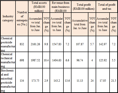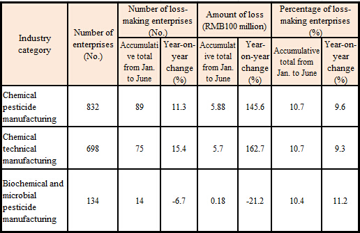 In the first half of 2015, despite strong growth in overall profit, the number of loss-making enterprises grew 11.3% year on year, with an amount of loss of RMB588 million, a big year-on-year increase of 145.6%; and the percentage of loss-making enterprises increased by 1.1 percentage point year on year. The number of loss-making enterprises, the amount of loss and the percentage of loss-making enterprises of chemical technical manufacturing enterprises all increased significantly year on year, while those of biochemical and microbial pesticide manufacturing enterprises all decreased relatively.
